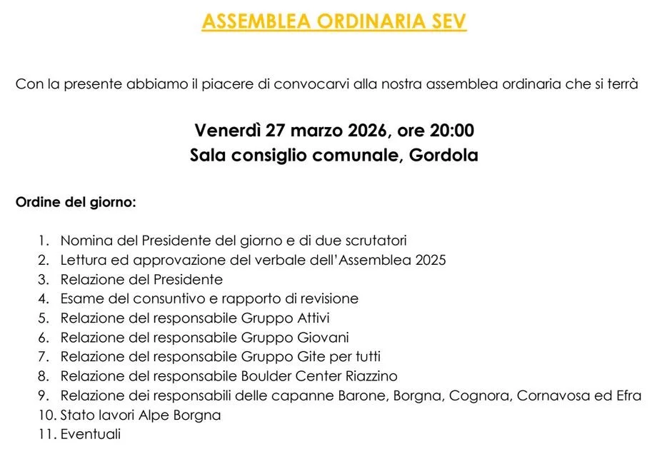 La SEV ha il piacere di invitarvi venerdi’ 27.03.2026 all’assemblea ordinaria 2026, dalle ore 20:00, presso la sala del Consiglio comunale di Gordola. In attesa di incontrarvi numerosi, vi salutiamo cordialmente, il Comitato SEV.