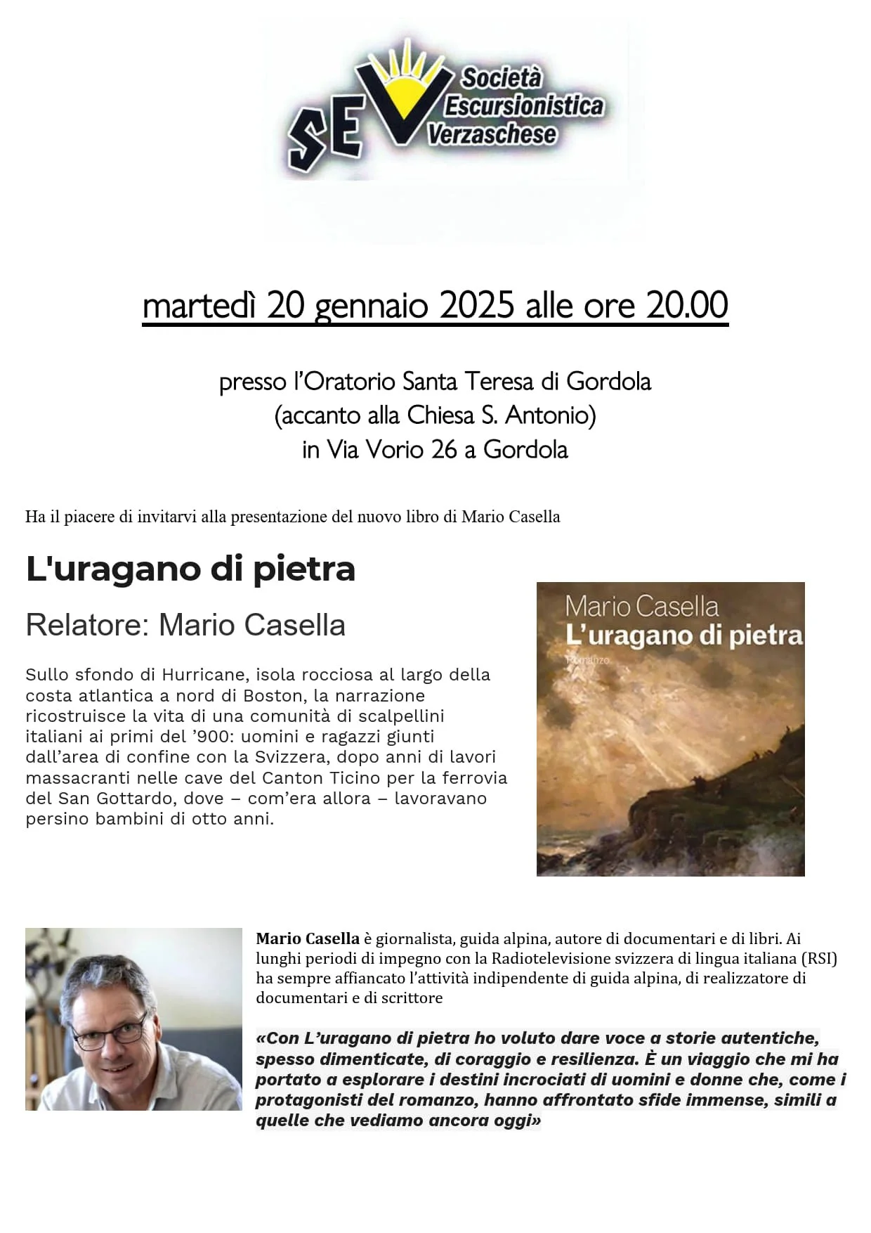La SEV vi invita all’incontro con Mario Casella, che presenterà il suo nuovo romanzo “L’uragano di pietra”, maredi’ 20.01.2026, alle 20:00, presso l’Oratorio Santa Teresa di Gordola. Un libro che racconta la vita di due ragazzi emigrati in America a inizio ‘900 dalle cave della Riviera e dalla Valle d’Intelvi verso Hurricane, una minuscola isola al largo della costa atlantica del Maine.