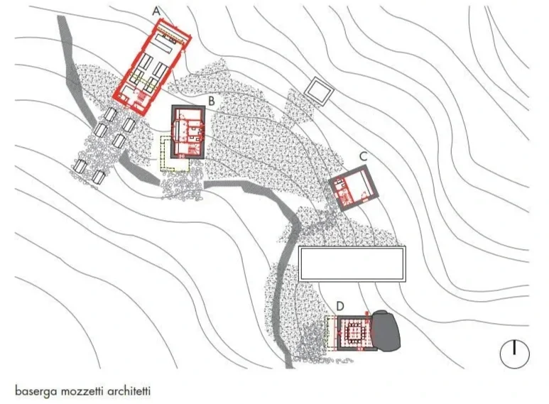 L'obiettivo del progetto di riqualificazione è la conservazione dell'insediamento con l'inserimento di una struttura ricettiva diffusa, distribuita nei diversi rustici. La funzione scelta per ogni edificio considera la pertinenza tra uso e dimensione, in modo da conservare l'insediamento nella sua forma originaria.